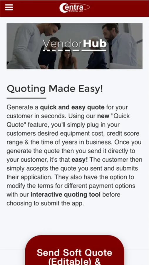 The Vendor Hub gives anyone who wants to become a Centra Funding Vendor the sales tools to set them ahead of your competition. Centra Funding Vendors can control their whole sales process and never lose control of their customer when they get "The Hub". If you have equipment to sell, you can become a Centra Funding Vendor!