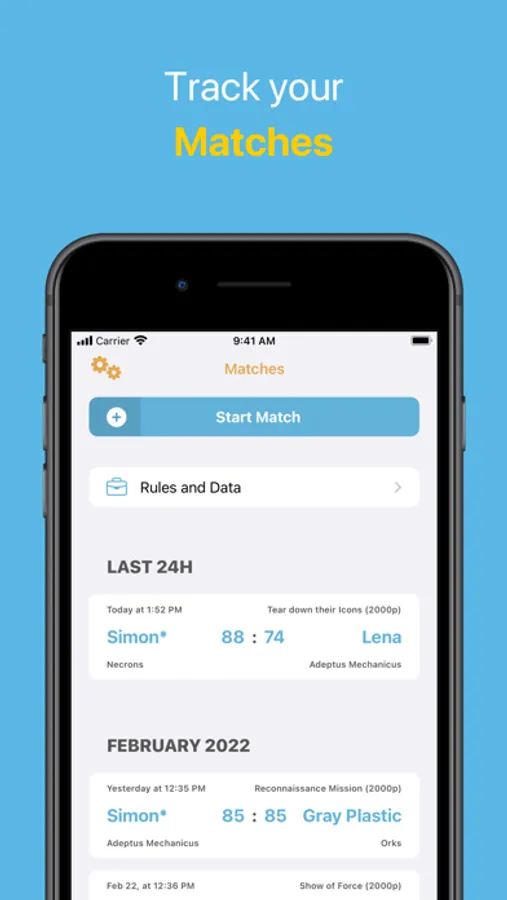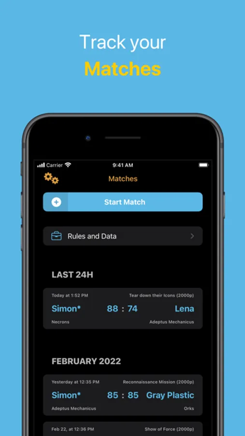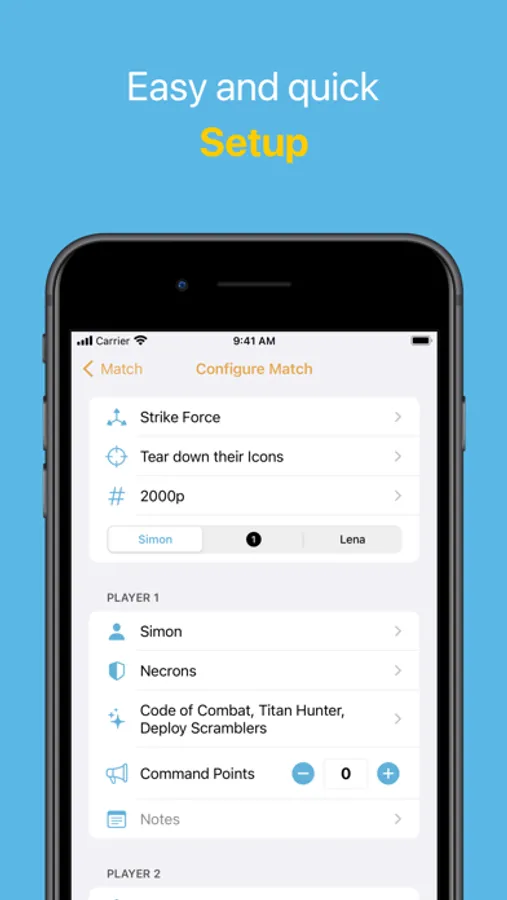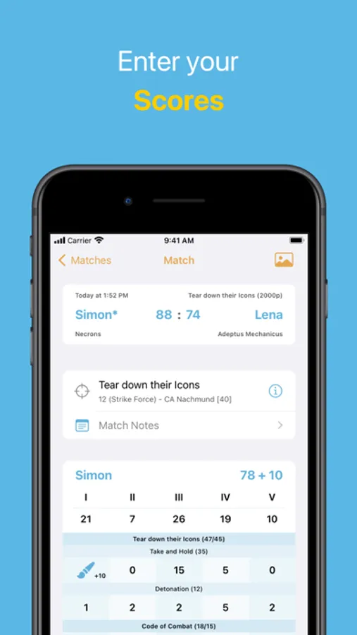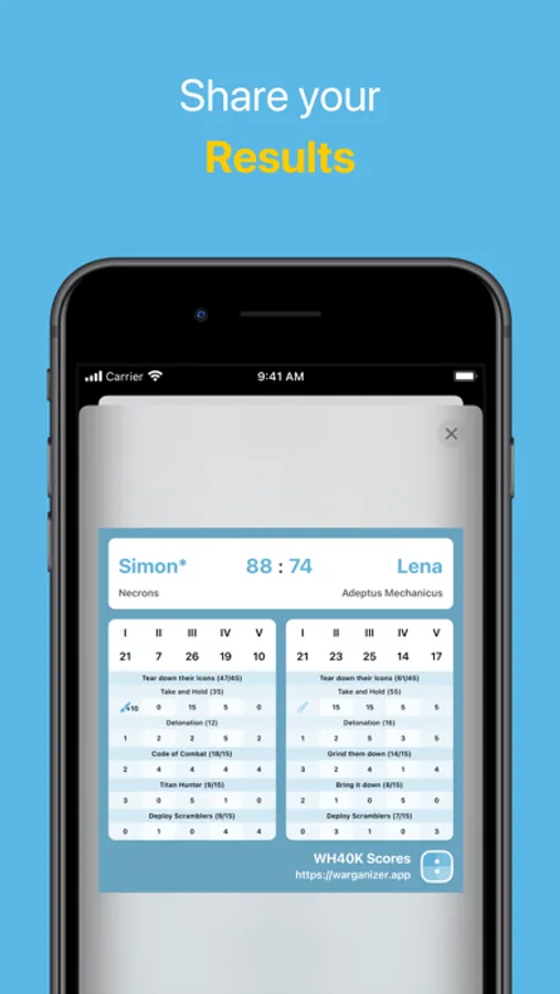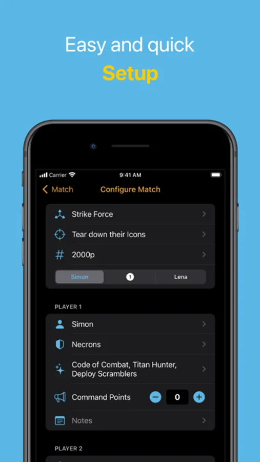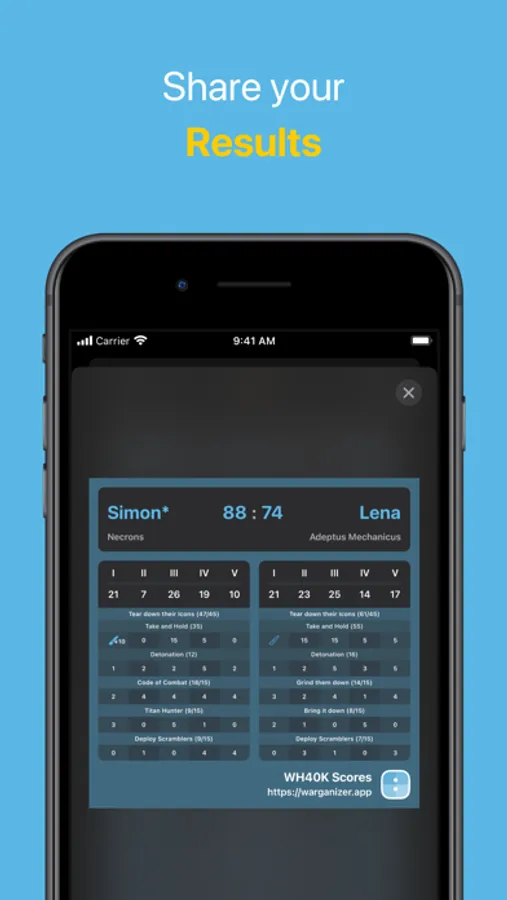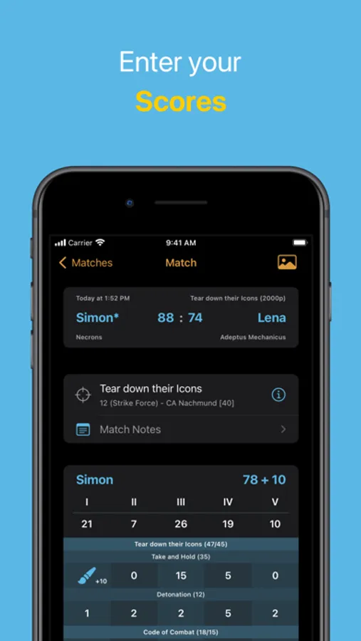No matter if you play in a tournament or at home with your friends, WH40K Scores simplifies your scorekeeping. Your matches, configurations and rules are synced between your devices via iCloud.