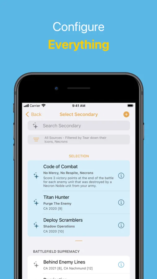 Supports matched play missions for the 9th edition of Warhammer 40K*. The app comes with missions and objectives from "Warhammer 40,000 Core Book, 9th Edition", "Chapter Approved: Grand Tournament 2020 Mission Pack" and "Chapter Approved: Grand Tournament 2021 Mission Pack" by Games Workshop. The data set contains the names and conenctions, actual rules are not included, please refer to the publications by Games Workshop. The app allows you to easily update these entries with rules texts for quick reference. You can also create new entries from other publications or custom data sets like from tournament packs.