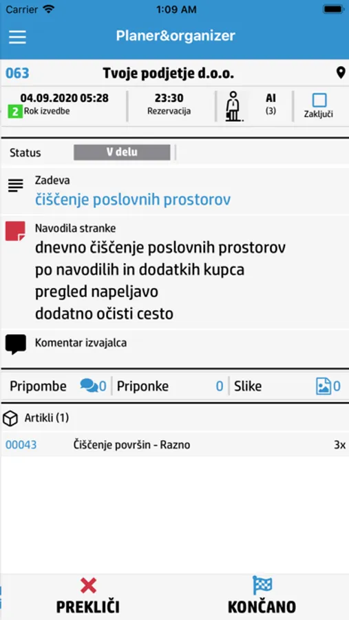 Nalogi lahko dodajamo pripombe, artikle in storitve. Nalogo lahko tudi merimo posledično s pomočjo avtomatičnega zagona mobilne aplikacije dotBusiness checkpoint.