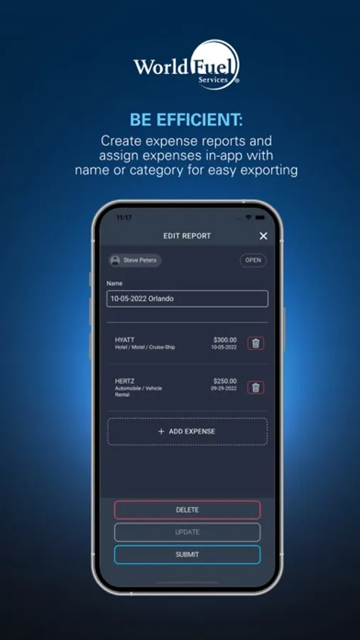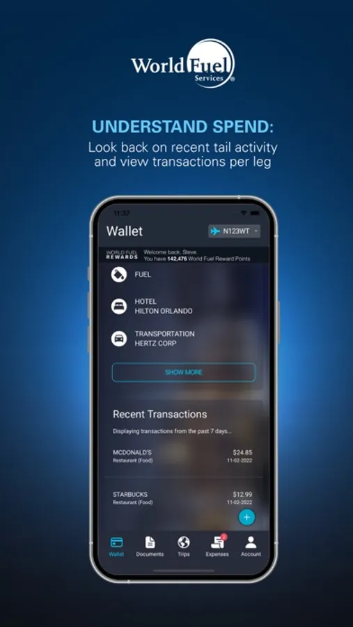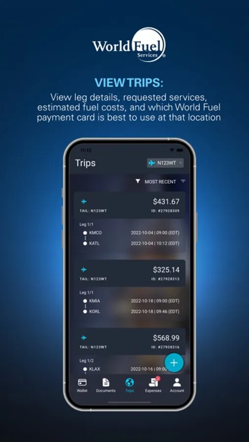 myWorld Wallet brings all World Fuel Services payment cards into a single app so pilots can purchase at the best prices and pay without leaving the aircraft with touchless transactions. From capturing receipts on every leg of the trip to reporting past and current transactions, myWorld Wallet simplifies the expense process from start to finish.