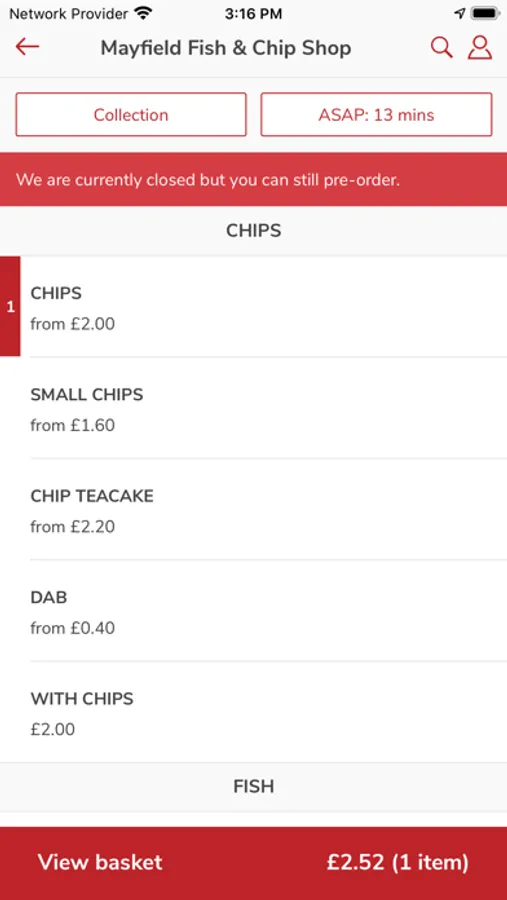 A traditional English fish and chip shop selling fried fish, chips and other products such as pies, sausages, peas, curry, gravy and a selection of drinks