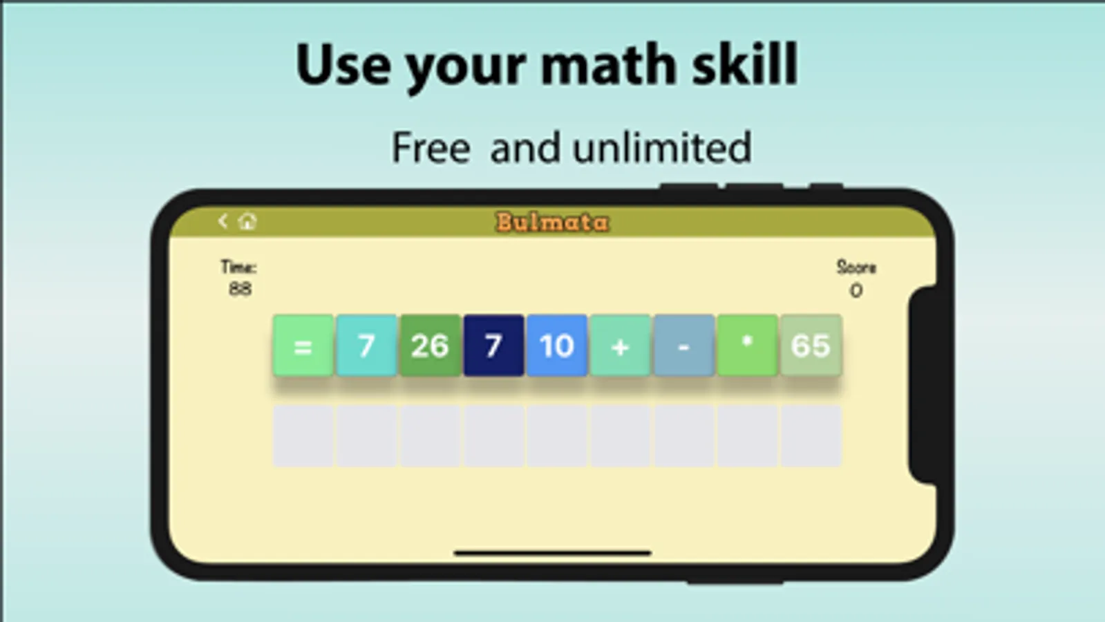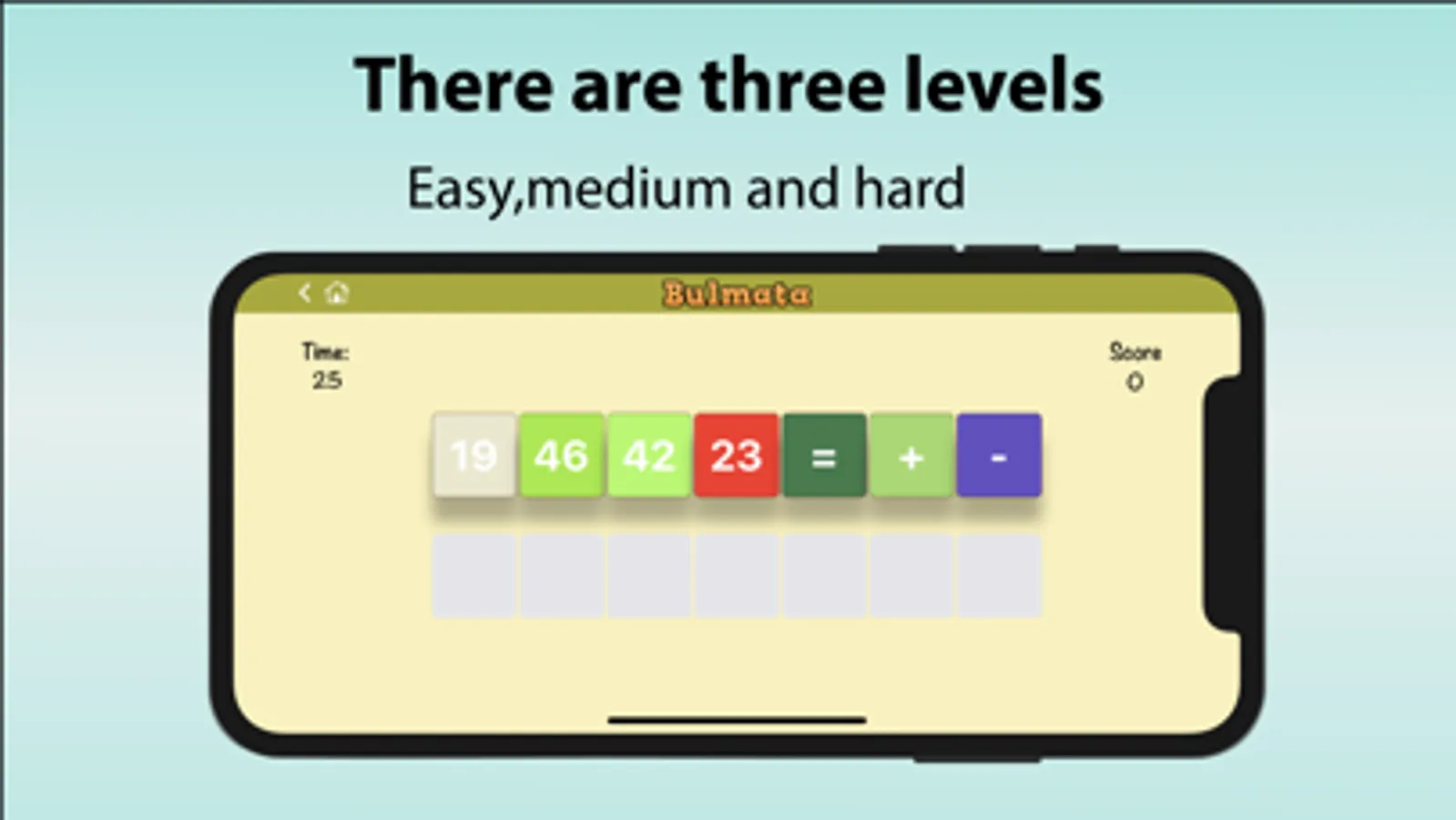 You create the equation by dragging and dropping the cards.There are three levels that easy, medium and hard. Cards come according to the level you choose.There are easy level less cards, difficult level many cards.Points change according to the level.You can also choose with or without duration.Accordingly, the score changes.Free, no internet required, no membership required.
