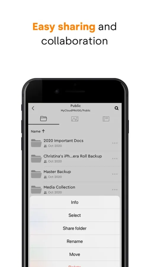 Easily share content with friends, family, and colleagues, or invite them to access your My Cloud NAS for seamless collaboration. My Cloud OS 5 makes it easy to share high-res photos and videos, a single file, or an entire folder using your smartphone or tablet.