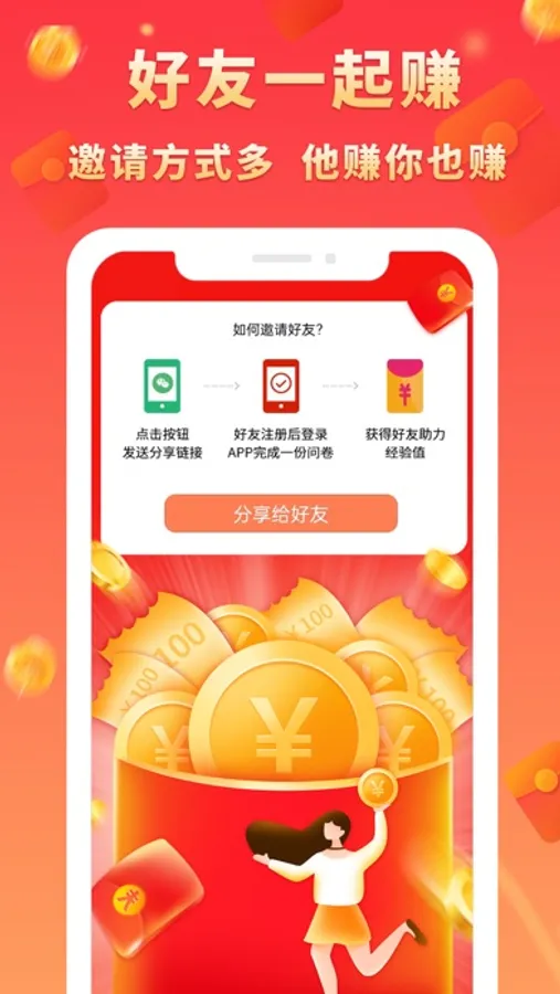 每成功邀请一位好友,可得200经验值奖励,好友完成调查还能获得20%持续性奖励,好友贡献无上限,好友越多,收益越多!