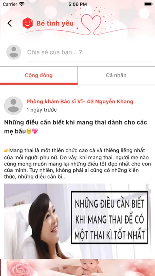 Không chỉ vậy, “ bé tình yêu” còn là một diễn đàn giúp các mẹ chia sẻ những thắc mắc, cảm xúc, kinh nghiệm mang thai của mình với các mẹ khác. Mỗi một bình luận của bạn hay khác sẽ mang lại cho bạn thêm kiến thức, thêm bạn bè giảm bớt áp lực khi mang bầu.