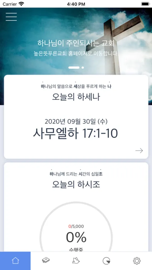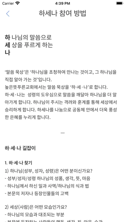 ‘말씀 묵상’은 하나님을 초청하여 만나는 것이고, 그 하나님을 직접 알아 가는 것입니다. 높은뜻푸른교회에서는 말씀 묵상을 ‘하·세·나’로 합니다.