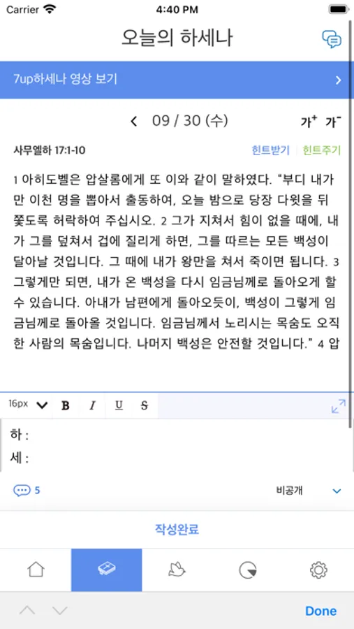 말씀묵상은 경건의 연습니다. 한 번에 완성되지 않습니다. 처음부터 길게 할 필요도 없습니다. 자신에게 가장 좋은 시간과 장소를 정해서 7분 동안 말씀을 읽고 묵상하는 연습을 하시면 나중에는 그 시간이 점점 늘어날 것입니다.
