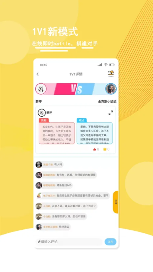 核心版块1v1:参与的两位用户以文字直播的形式发表自己的看法。这个版块分为问答和辩论两种模式,问答模式是用户以一问一答的形式进行的,而辩论模式则是严格的要求必须将反驳区域和观点区域填写完整,才可以进行发言。其他用户能随时观看他们的发言,如果喜欢,可以点赞并进行打赏。