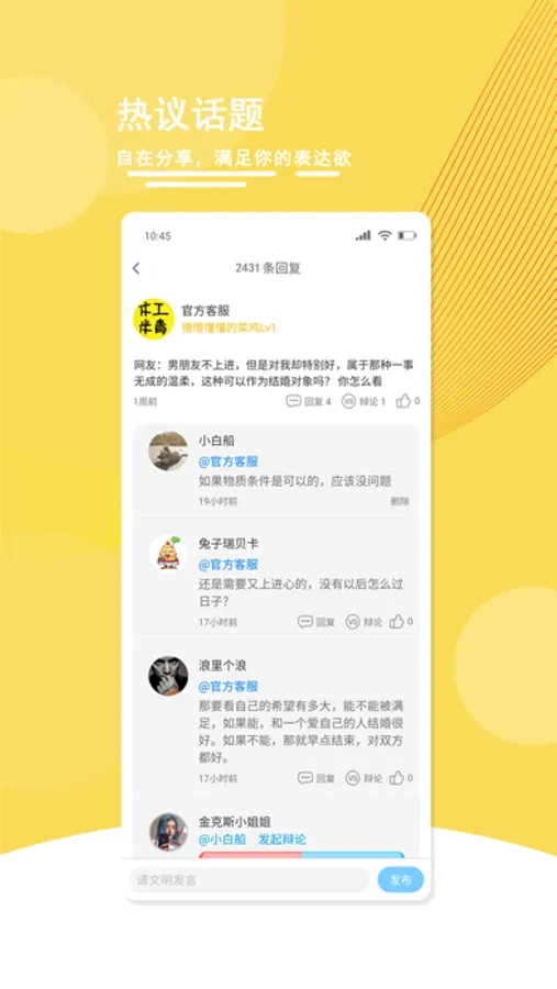 用户可以发布帖子提出自己的问题,等待别人解答或和别人一同探讨;也可发表自己对事物的看法,与其他用户一同讨论,多角度的了解不同的答案。评论模式分回复,辩论两种,辩论必须有理有据,有质疑有观点,缺一不可。