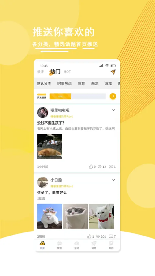 用户参与感:我们单独为开发更新在app内做了开发进度管,用户可以时刻查看接下来的更新内容,点击进入后可以在评论区提出自己对app的看法与建议,我们会采纳一些“用户的优秀的建议”并且加入开发周期中,并将该条建议在醒目位置公示。