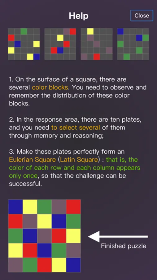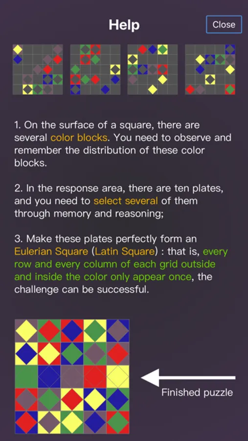 3. Make these plates perfectly form an Eulerian Square (Latin Square) : that is, every row and every column of each grid outside and inside the color only appear once, the challenge can be successful.