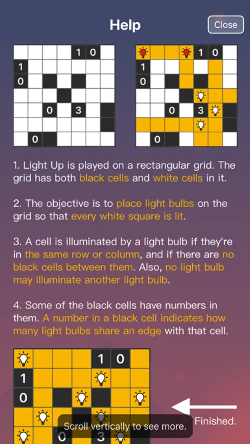 3. A cell is illuminated by a light bulb if they're in the same row or column, and if there are no black cells between them. Also, no light bulb may illuminate another light bulb.