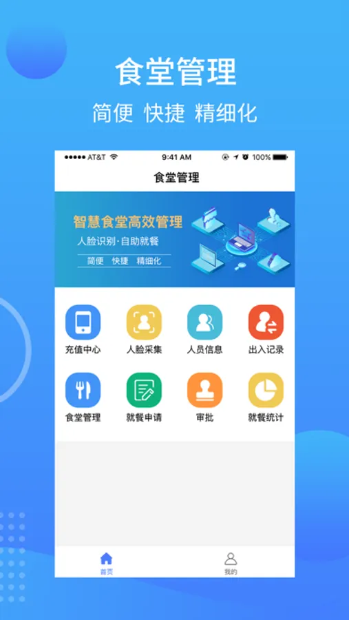 智慧食堂:一款食堂管理软件。就餐人员通过APP实现费用充值,就餐费用与人脸信息进行绑定,人员通过刷脸的方式进行扣费就餐,费用不足时设备给予提醒,管理人员通过PC端实现多维度的就餐数据的统计分析,实现智能化、智慧化食堂管理。