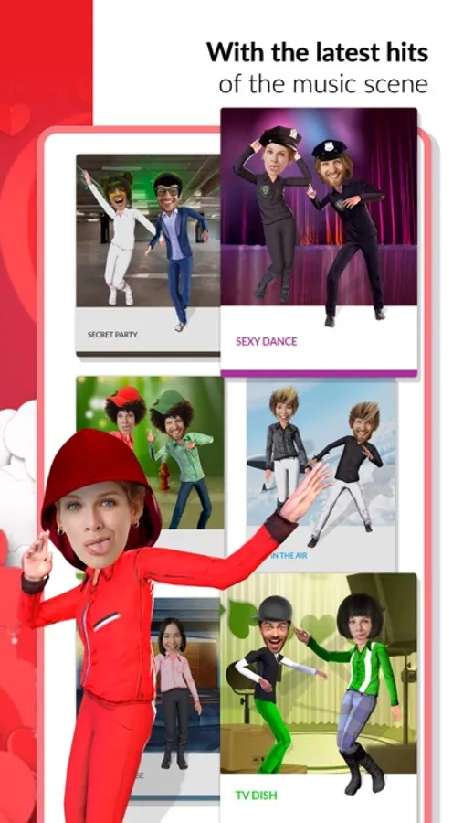 Create content for such holidays as Christmas, New Year, Valentine’s Day, Halloween, Thanksgiving and more – and this is not even a full list. Pick up a template that matches your occasion and upload your face. This free dancing app provides a diversity of choices considering templates.