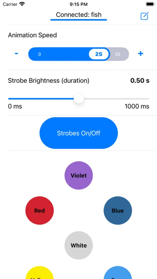 Control the animation speed from 0 to 33 frames per second. The framerate is precisely calculated to allow you to synchronize for filming (with the strobes on or off).