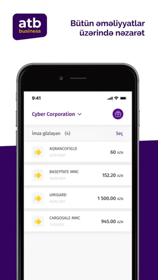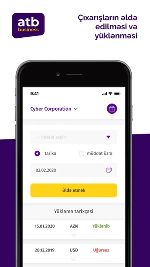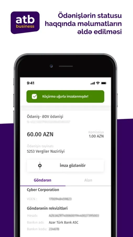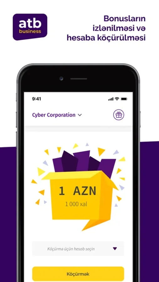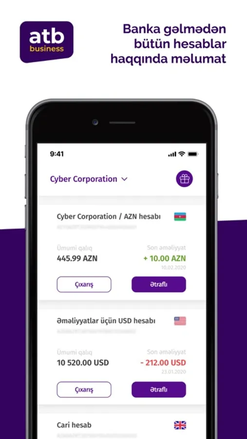 ATB Business biznes üçün yeni mobil tətbiqdir. Bu istifadəsi sadə olan bank tətbiqi 24/7 sizin etibarlı və rahatlığınızı təmin edən bank yoldaşınız olacaq. Tətbiqin əsas funksional imkanları aşağıdakılardır: