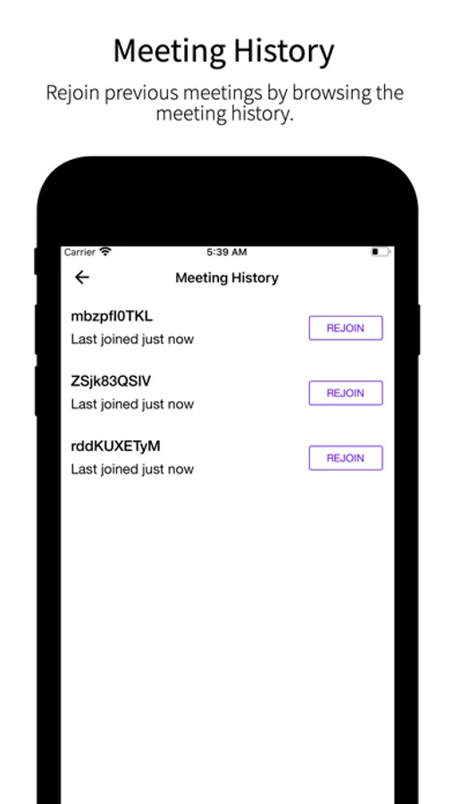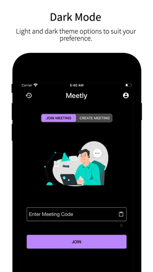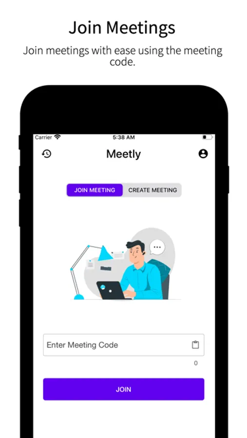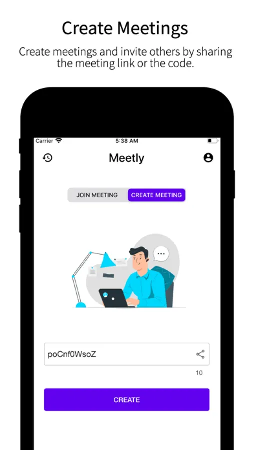 Meetly allows up to 70 participants in a single meeting. Create a meeting and invite others to join the meeting by sharing the meeting code right from the app. You can also rejoin previous meetings by browsing the meeting history.