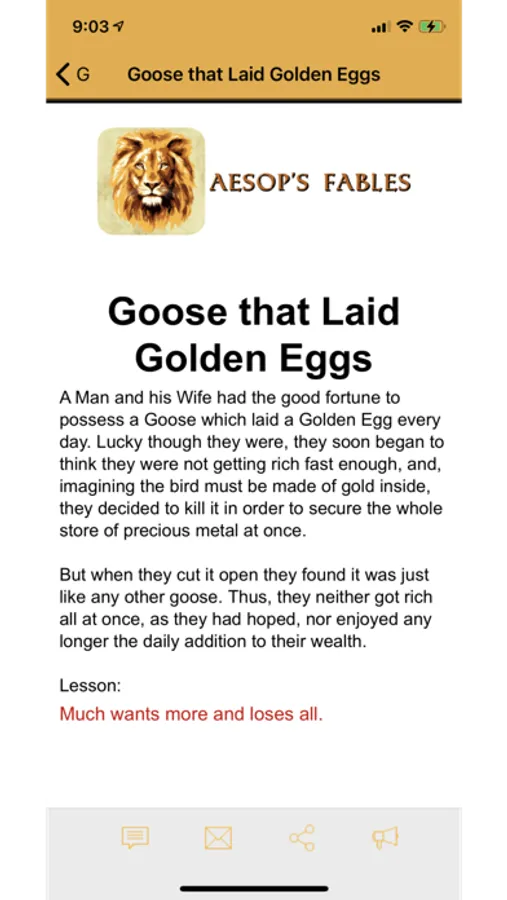 This app contains over 200 stories, alphabetically arranged) of Aesop's Fables includes such classics as: "The Fox & the Grapes", "The Boy Who Cried Wolf" , "The Wolf in Sheep's Clothing".