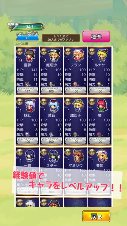 レベルの高いキャラから20人がスタメンキャラとして戦闘画面が登場します。