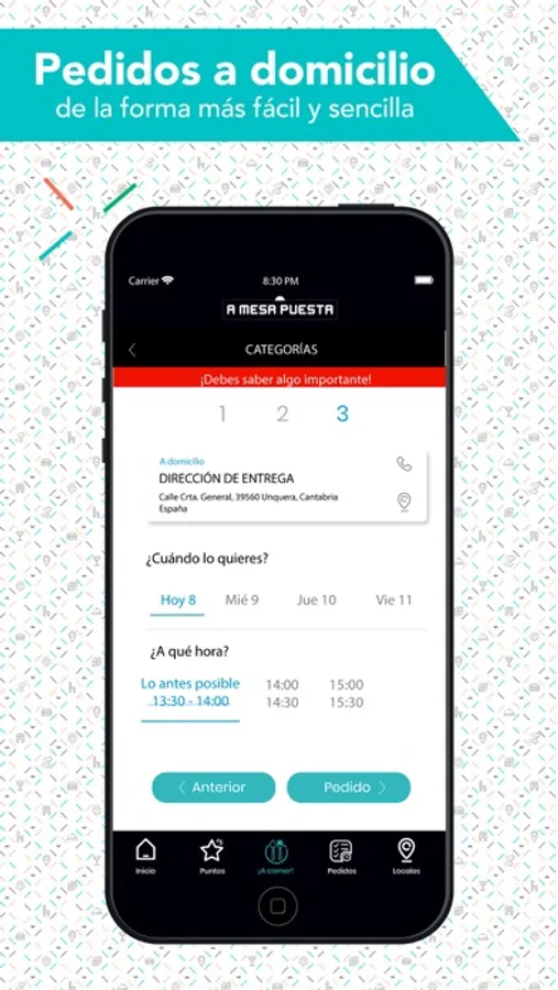 Pide lo que quieras en A Mesa Puesta y nuestro equipo de repartidores & camareros te lo acercarán en pocos minutos. Puedes realizar tu pedido en el móvil desde cualquier lugar y te lo llevamos dónde tú quieras.