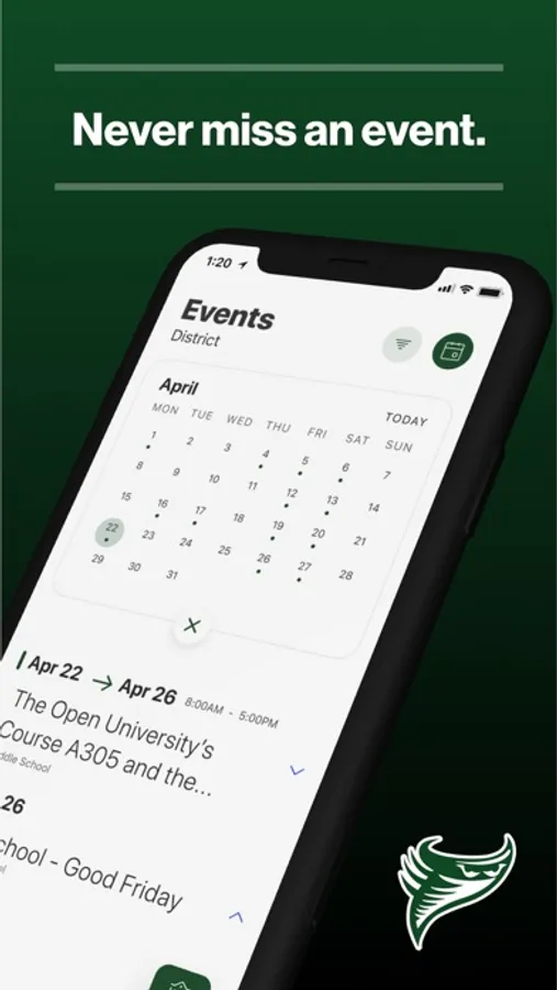 The event section shows a list of events throughout the district. Users can add an event to your calendar to share the event with friends and family with one tap.