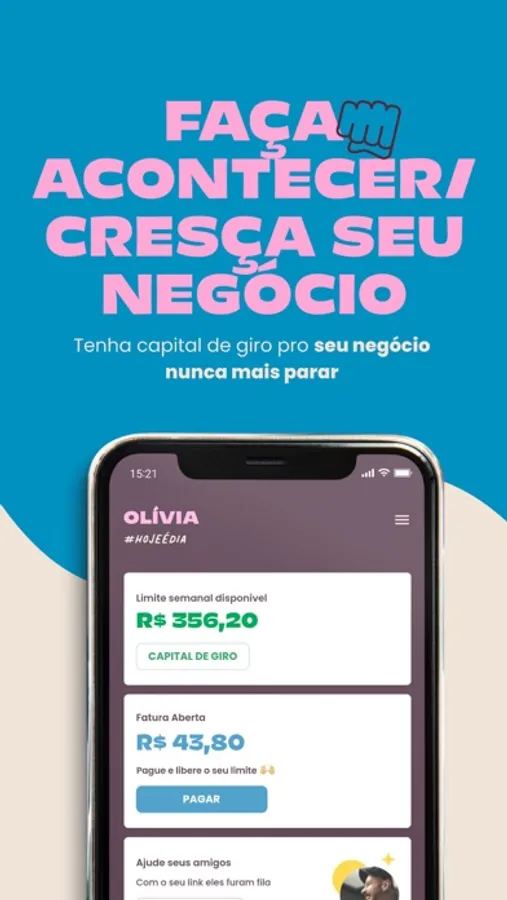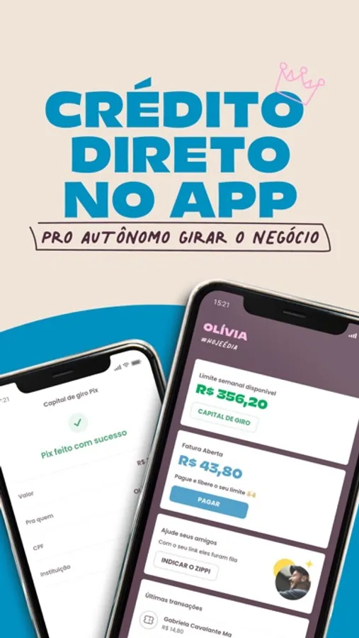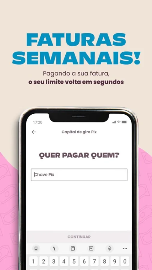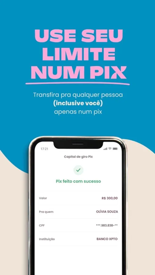 E você usa seu limite num PIX. Pode pagar fornecedores, fazer compras e até transferir pra sua própria conta. Nunca mais vai faltar dinheiro pro seu negócio girar!