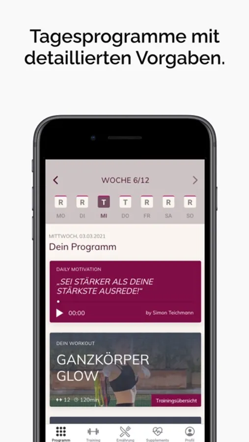 Gezieltes und persönliches Training mit kostenlosen Minibändern welches individuell auf deinen Bedürfnissen abgestimmt wird. Plane einfache Mahlzeiten, ernähre dich gesund, erhalte leckere Rezeptideen und vieles mehr – freue dich auf deine Transformation in 12 Wochen ganz einfach mit einem Training inklusive Minibändern von Zuhause, im Park, während der Mittagspause im Büro oder auch im Fitnessstudio. Trainiere wo du willst und wann du willst! Diese App wird dir dabei helfen schlank und fit zu werden in nur 12 Wochen. Durch eine ausgewogene Ernährung, individuelle Trainingseinheiten und aktiven Erholungspausen wird dich Diplom Psychologe und erfolgreicher Personal Trainer Simon Teichmann auf dem Weg zu deiner perfekten Figur begleiten.