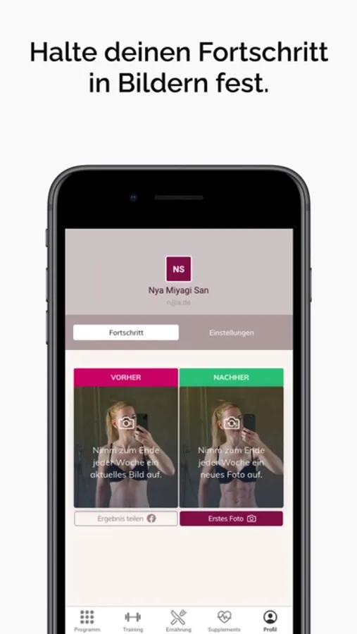 Sieh dir deinen Fortschritt und deine Transformation an. Über die Fotofunktion kannst du immer dein „Altes“ Ich mit deinem „Neuen“ Ich vergleichen. Teile es auf Facebook um die Ergebnisse mit deinen Freunden, Familie und Bekannten zu teilen.