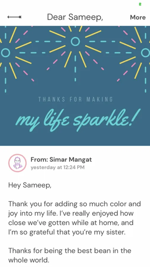 We hope you enjoy using DearYou to send little bites of love to the people you care about. Our app offers hundreds of free digital cards that you can easily send to any of your contacts with a custom note.