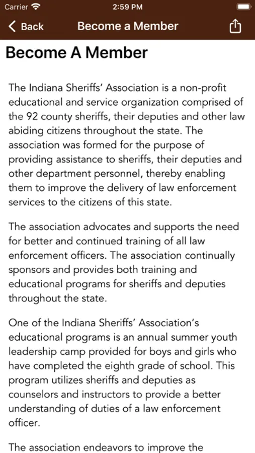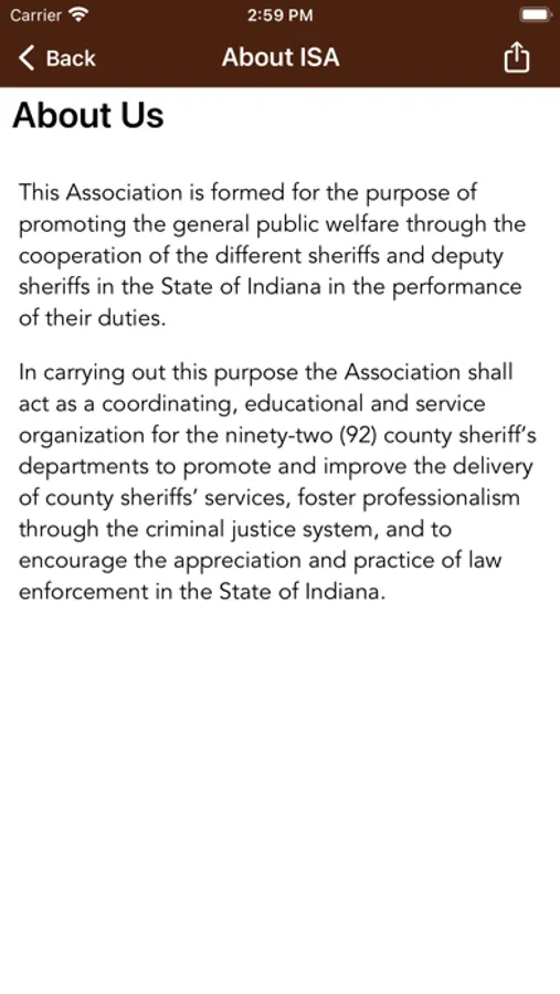 The Indiana Sheriffs’ Association mobile application is an interactive app developed to help improve communication with current ISA Members and the citizens of their Sheriff’s Office. The ISA App allows ISA Members to connect quickly to the ISA to become a member, support ISA initiatives, make a donation and other interactive features, as well as providing the community the latest public safety news and information.