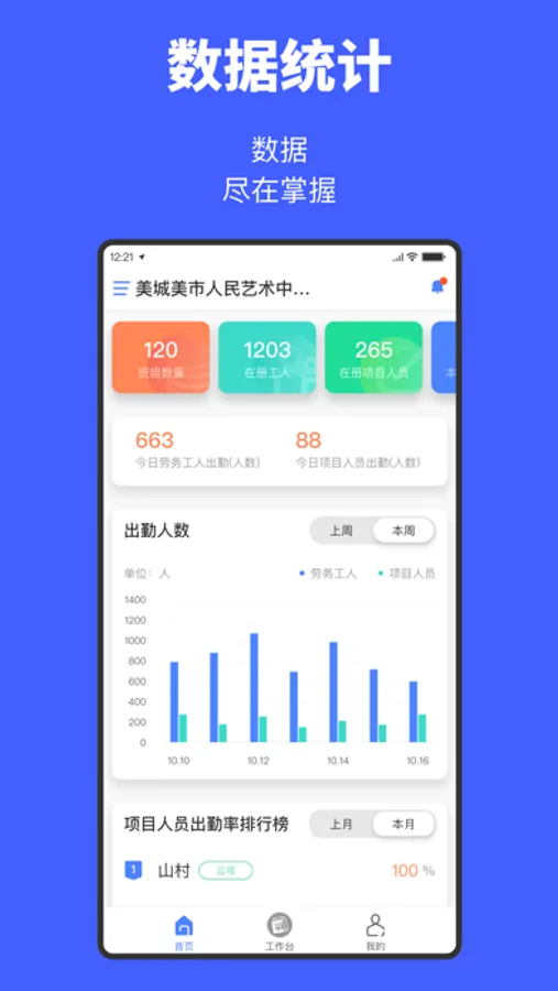 1、数据统计:支持查看当前在场工人、出勤人数、记工数据等信息