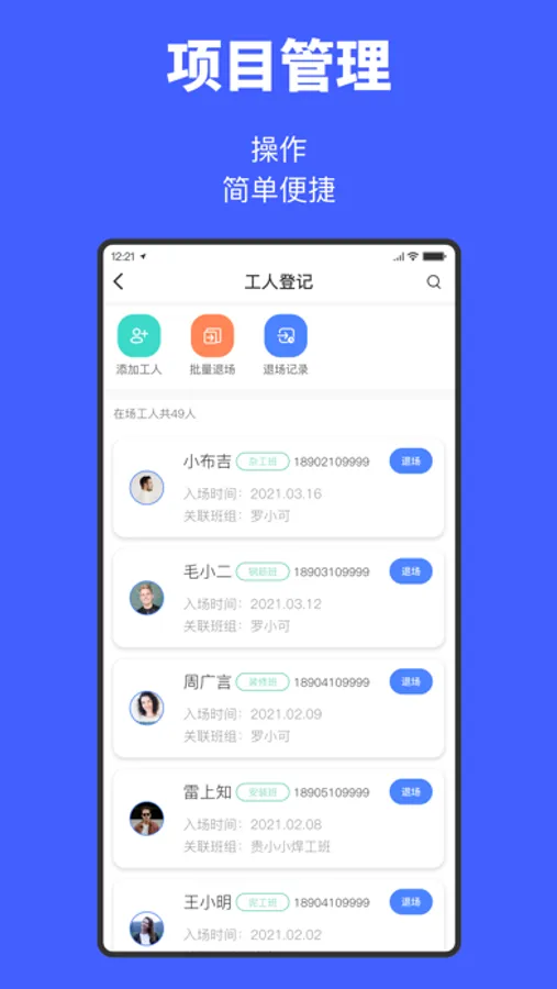 3、项目管理:实现工人快速进场、退场、个人信息等管理