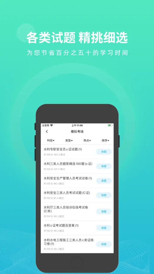 水利三类人员题库APP有模拟考场、历年真题练习、快速练习、考点练习、做题记录等多种学习与做题模式、丰富多样化的陪你一起考水利三类人员考试。