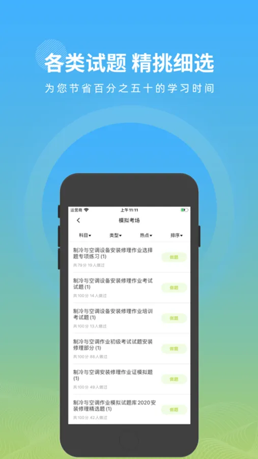 高处作业题库APP是一款针对高处作业考试的题库,涵盖了该考试热点、难点和常考点的考试模拟题库,是您学习和拿高分 的好帮手。制冷与空调作业题库APP的主要特点:
