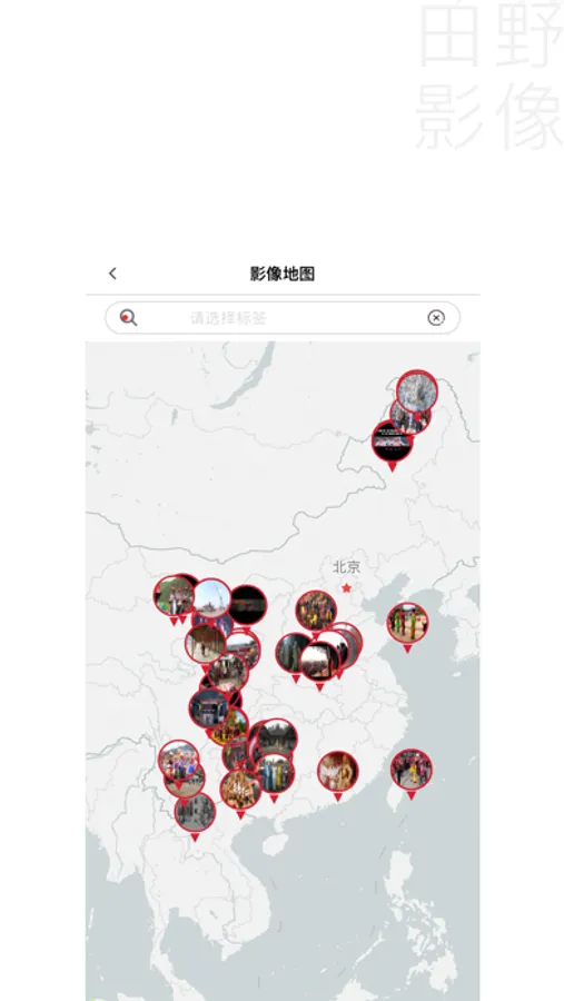 地图上各个 区域 的影像作品进行探索,也可以查看某一 标签类型 的影