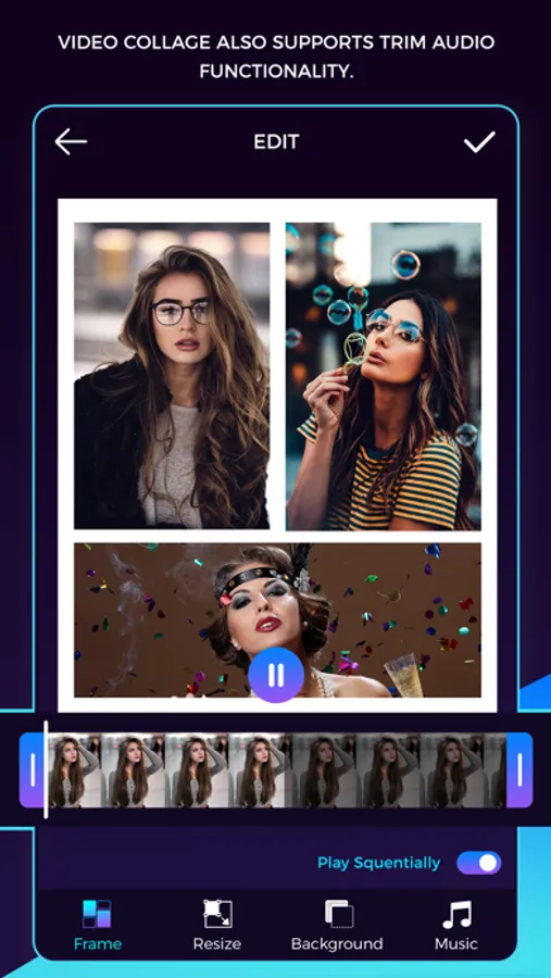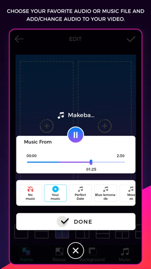 Video collage Maker takes multiple videos and music as you like and make collage video.