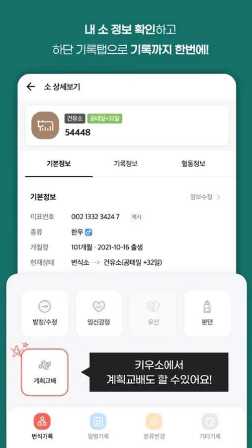 - 소의 이력, 혈통, 질병, 번식, 출하기록과 목장일정을 저장하고 차트로 정리해서 수의사,수정사, 컨설턴트에게 공유할 수 있습니다.