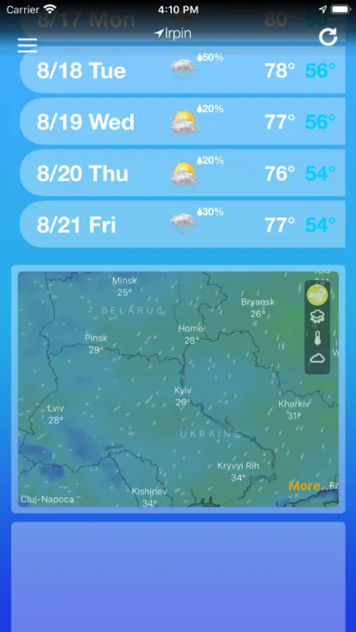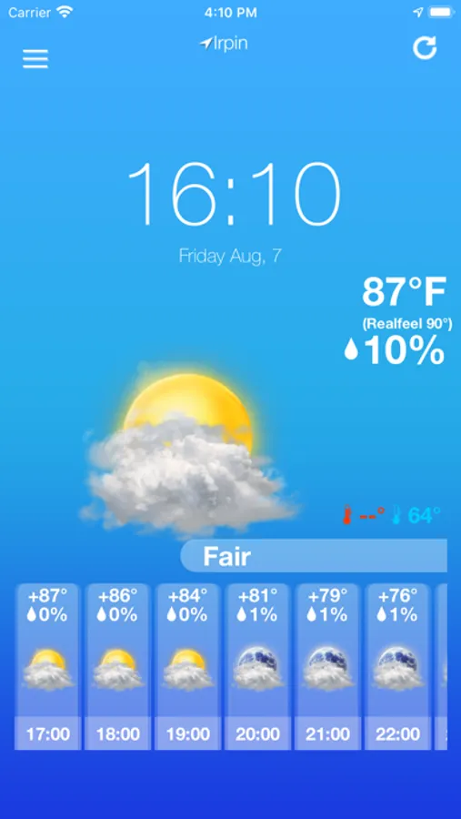 Weather forecast detects weather in your current location automatically. There are many information in weather forecast which includes weather condition, atmospheric pressure, relative humidity, visibility distance, precipitation in different unites, dew point, wind speed and direction, in addition to ten days future forecast, also hourly weather forecast.