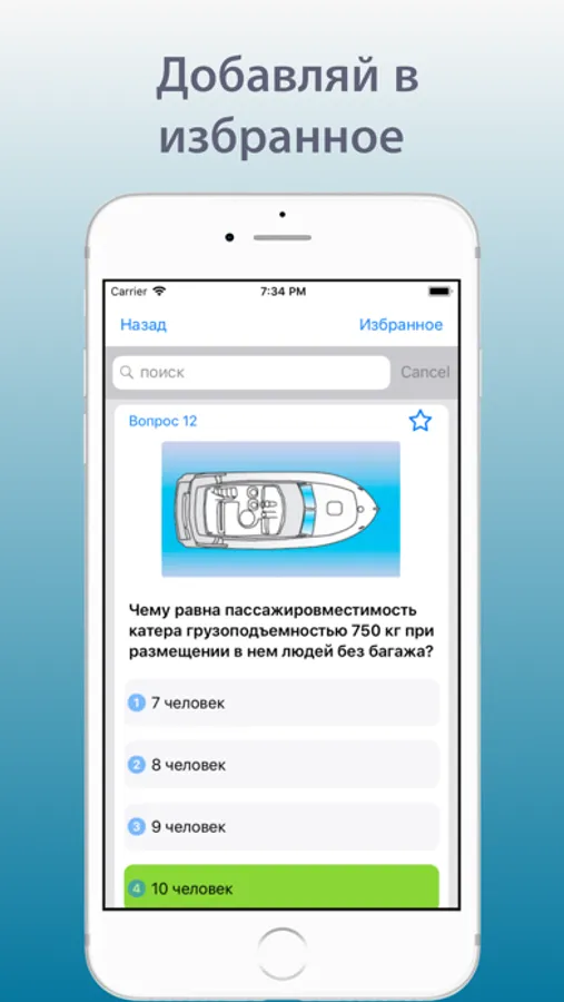 - Экзамен ГИМС для аттестации граждан на право управления катерами с главными двигателями мощностью до 55 кВт и моторными лодками на внутренних водных путях (район плавания «ВВП») Курс представляет собой тест-тренажер, включающий вопросы и правильные ответы. Возможности приложения:• Подготовка - Позволяет изучить вопросы в текстовом формате с отмеченными правильными ответами; • Марафон - Предлагается ответить на все вопросы с возможностью выбора вопросов или же все вопросы, без ограничения по времени и ошибкам;• Режим "Экзамен" - режим максимально приближенный к реальному экзамену.• Работа над ошибками - в режимах "Экзамен", "Марафон" и "Тренировка в избранном" Вы можете сделать работу над ошибками. Преимущества:• Приложение не требует соединения с интернетом;• Тесты всегда "под рукой".• Множество режимов для работы с тестами.Данный тест-тренажер поможет подготовиться к проверке и освежит память.