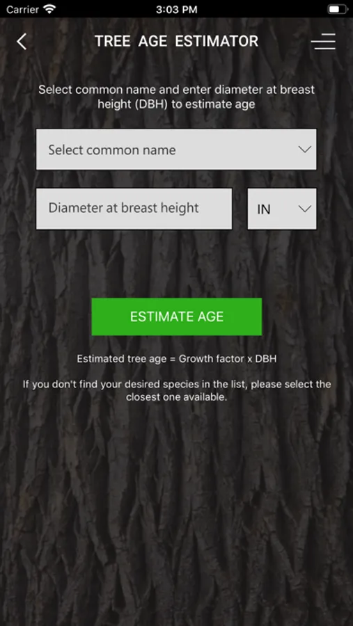 The tree estimator tool uses a species growth factor and tree diameter to provide a rough approximation of tree age. The app uses published growth factors and only a limited number are available. However, this serves as a starting point for estimating individual tree age.