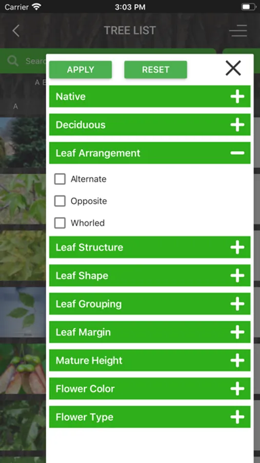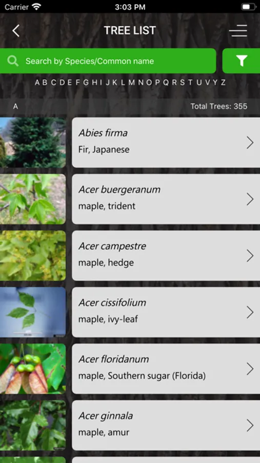 There are two ways to search for species. One, a simple key by characteristics directed approach, allows users to select one or more tree characteristics from large color icons. At any point in the process the possible species may be displayed. The other way is to select certain filters from the A-Z species list. The filter tool can also narrow down possible choices at any stage in the keying process. The species list is searchable by common or scientific name, or simply alphabetically.