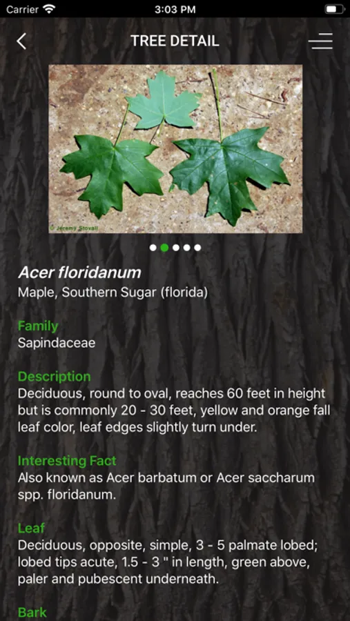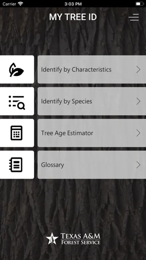 My Tree ID, developed by Texas A&M Forest Service, facilitates tree species identification based on leaves, flowers, seed, bark or location using a key, descriptions, and tree images. It contains over 1500 images from 475 different tree species and includes known occurrence maps from the Biota of North America Program for nearly all species. Individual tree detail pages have complete descriptions including interesting facts and similar species. The map feature allows users to input an address, select current location, or click on any point on the map to narrow the list. A full glossary and a tree age estimator tool complement the key and species list.