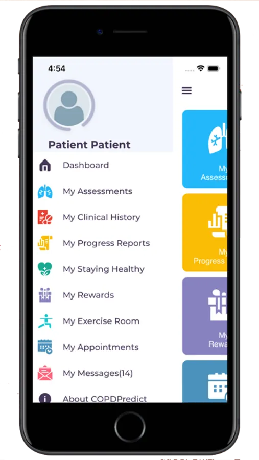 COPDPredict™ uses a combination of your-reported wellbeing scores, lung function and biomarker levels to generate your own personal health profile. Exacerbation prediction algorithms determine the potential risk of an exacerbation of COPD based on your data inputs. Your healthcare team can then provide you with the tailored support and intervention you require closer to home. You can also communicate regularly and securely with your healthcare team using the within-App messaging facility.