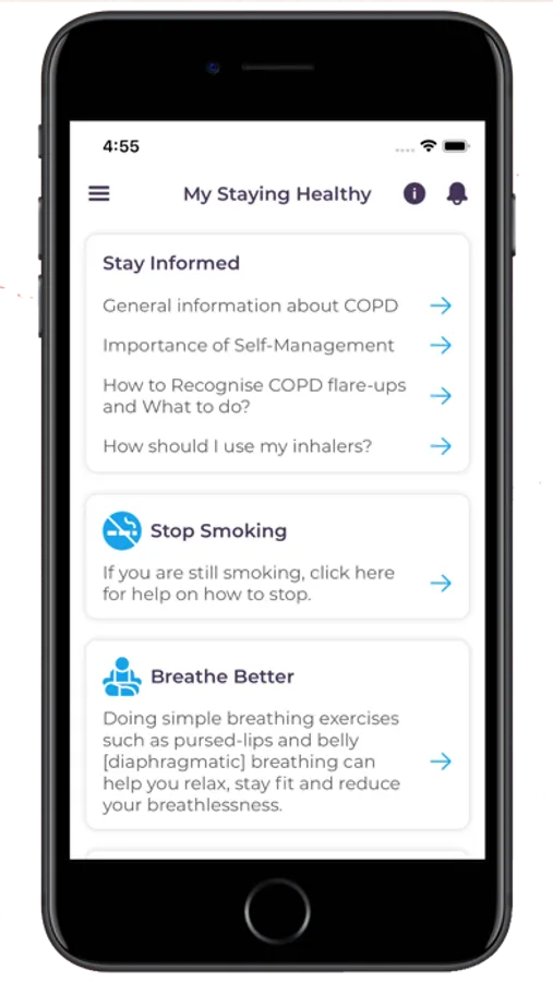 In addition, COPDPredict™ offers you a suite of digital educational material on healthy living, inhaler technique and pulmonary rehabilitation to help you self-manage your COPD and remain in control.