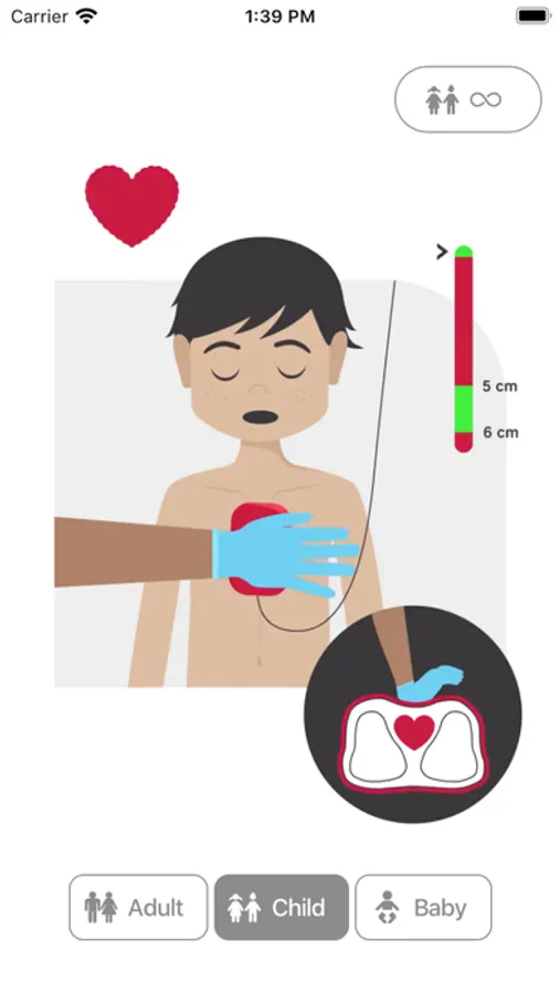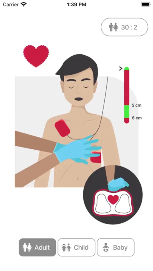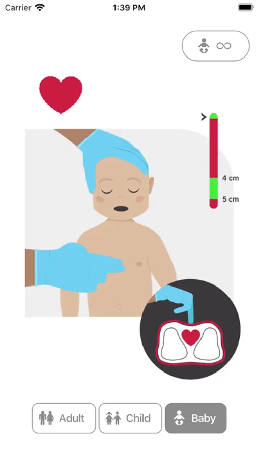 When the resuscitation mode is selected, the app will begin to assist by providing you with one-time chest compressions at a rate of 110 compressions per minute.