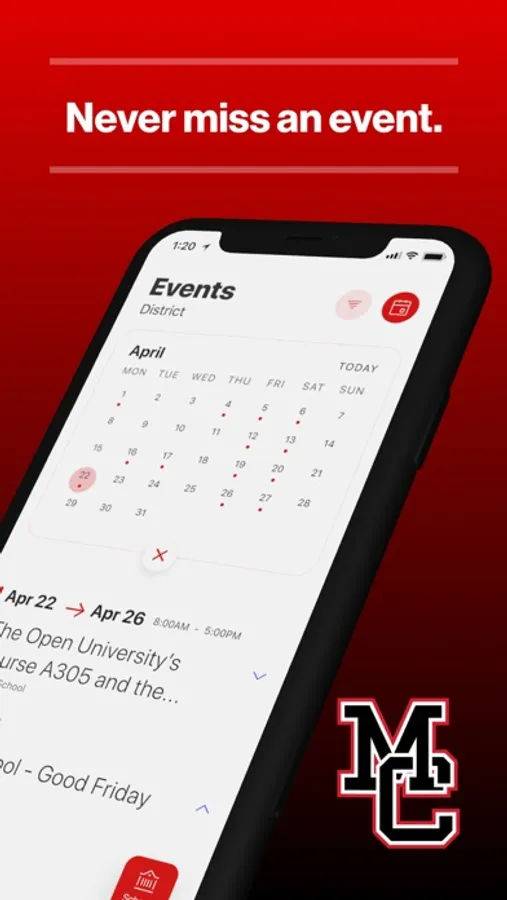 The event section shows a list of events throughout the district. Users can add an event to your calendar to share the event with friends and family with one tap.