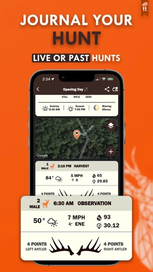 The TrophyTracks hunting journal provides real-time location, sunrise, sunset, weather attributes, and moon phase while also saving the temperature, wind speed, wind direction, pressure, humidity, and location for each entry you log. Over time, by logging hunting journals, a hunter can better understand how game moves depending on the time of the year and weather conditions. Hunters can use past journals and locations to understand where the most observations and harvests happened, unlocking the power of TrophyTracks to put you in the right spot, at the right time.