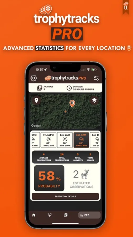 For advanced statistics and to get a complete understanding of game movement and predictions, the TrophyTracks PRO version provides hunters with the ability to see the observations made by time of day, temperature, and wind direction. Hunters can look at current conditions and forecasted weather data to align the perfect conditions to hunt your best locations. In addition, TrophyTracks PRO allows you to save more than 25 trail cam images or any hunting photos to your journals.