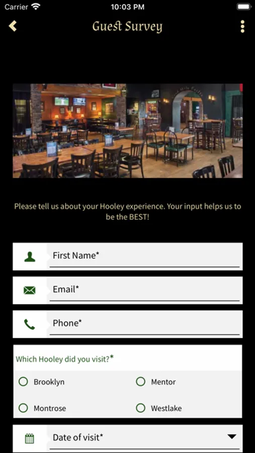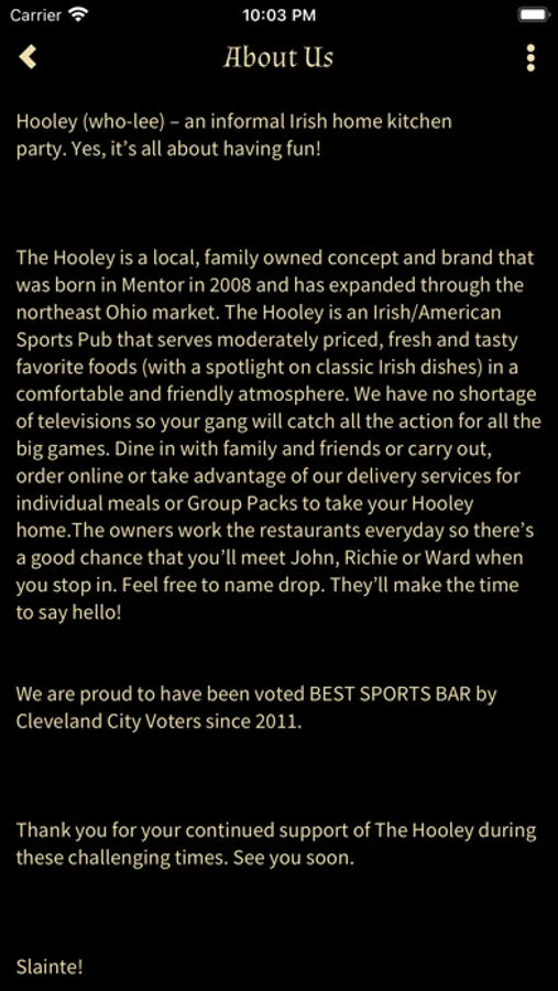 The Hooley Pub & Kitchen app offers everything Hooley at your fingertips. Order Online for carry out and delivery, make a reservation, view our complete menu contact-free, manage your Hooley Club loyalty and rewards card, join the Hooley team, contact any Hooley location or get directions with the touch of a button, interact with our social networks, send a Hooley eGift card and so much more. Also, Hooley Pub & Kitchen offers discounts and deals that are exclusive to The Hooley app users. Download The Hooley app and hold The Hooley in the palm of your hand.